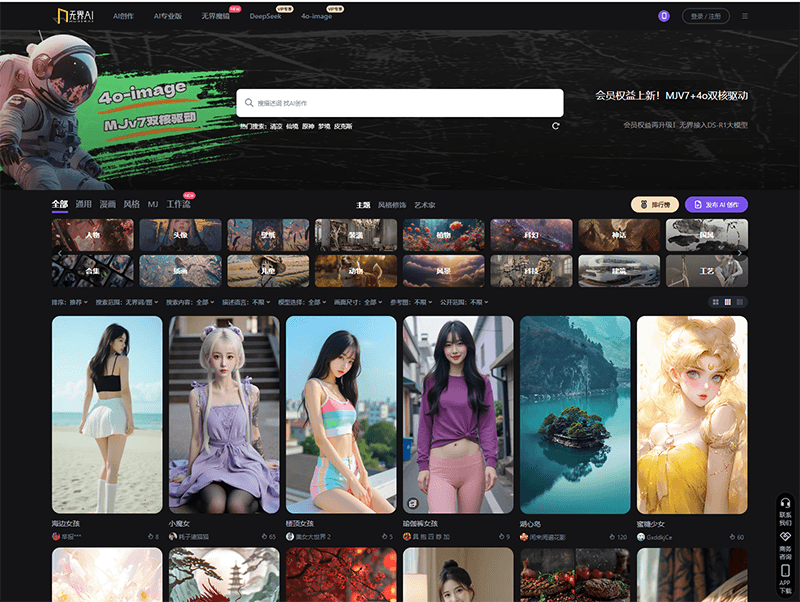 无界AI,集prompt搜索、AI图库、AI创作、AI广场、词/图等为一体。提供一站式AI搜索-创作-交流-分享服务。