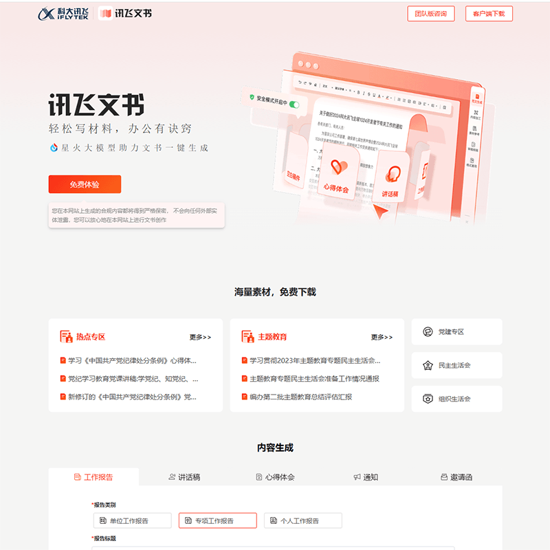 讯飞文书,是基于讯飞星火大模型进行文书数据定制训练,面向文书写作群体推出的一款AI材料写作平台。