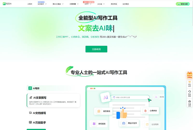 笔灵AI写作国内领先的AI写作助手与智能工具。专为提高写作效率而设计,提供免费的AI文章改写、论文辅助、商业计划书撰写等服务。无论是学术写作还是商业文案,笔灵AI写作都能快速生成高质量内容,简化您的写作过程。工作汇报PPT 、心得体会、演讲稿、分析报告 等200+真实场景一键生成