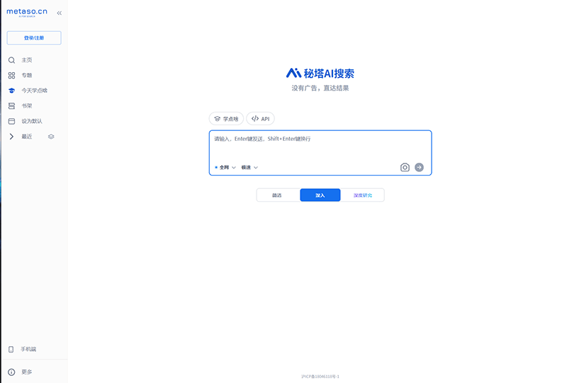 秘塔ai搜索,一个基于大模型的新一代智能搜索引擎,秘塔AI搜索通过其强大的语义理解能力和全网搜索功能,通过理解用户意图,提供无广告、高质量的搜索结果,让用户快速直达所需信息。