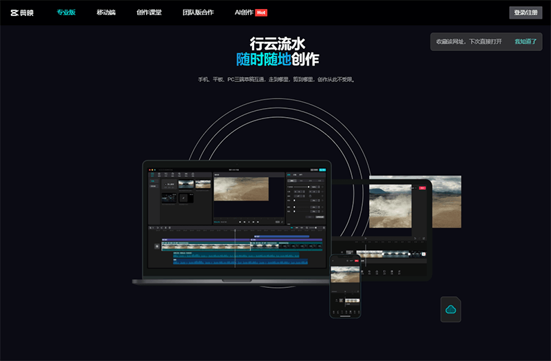 这是关于剪映专业版的官方网站介绍,强调其作为一款全能易用的桌面端剪辑软件,可以让用户的创作变得更加简单。提供了剪映专业版的免费下载服务,并包括Windows端和Mac端版本。