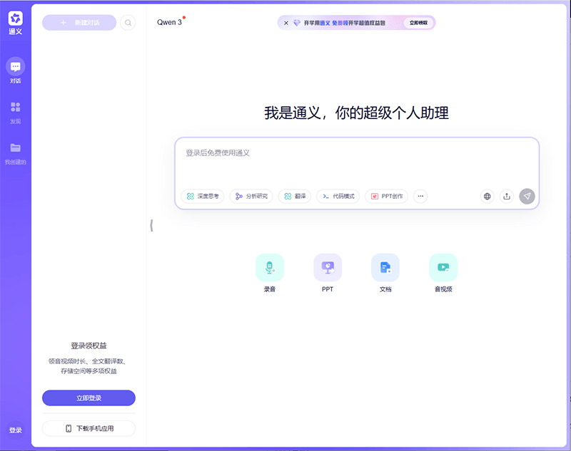通义是一个通情、达义的国产AI模型,可以帮你解答问题、文档阅读、联网搜索并写作总结,最多支持1000万字的文档速读。