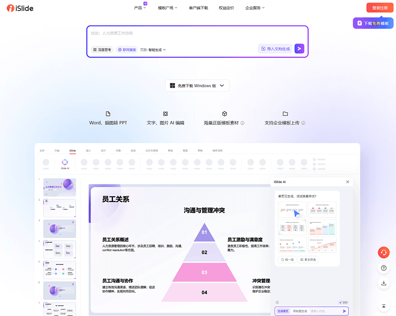 欢迎访问iSlide官网,简单,好用的PPT插件下载!拥有10万+ 原创可商用PPT模板,PPT主题素材,PPT案例,PPT图表,PPT图示,PPT图标,PPT插图和800万+正版图片。工具提供86个设计辅助实用功能,一键解决PPT设计制作中的难题。