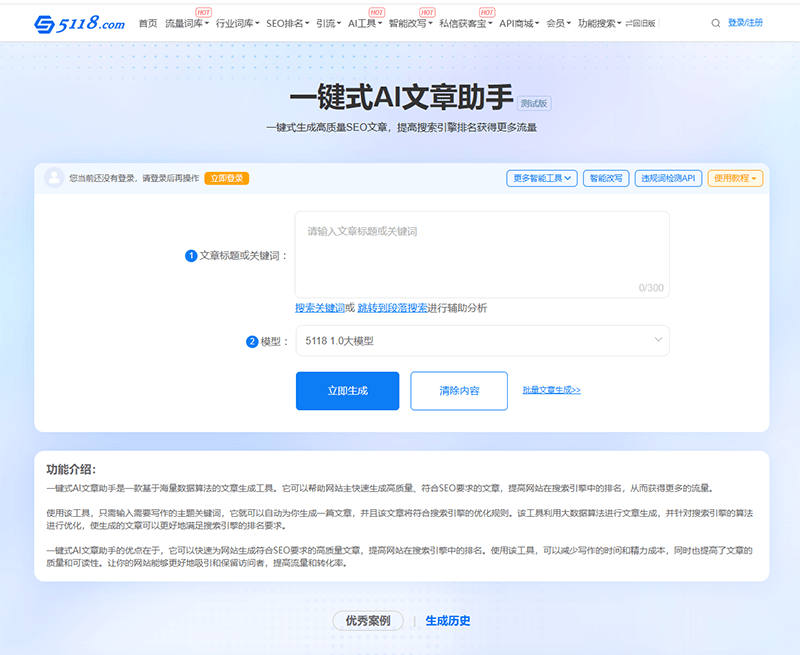 一键式AI文章助手是一款基于海量数据算法的文章生成工具。它可以帮助网站主快速生成高质量、符合SEO要求的文章,提高网站在搜索引擎中的排名,从而获得更多的流量。